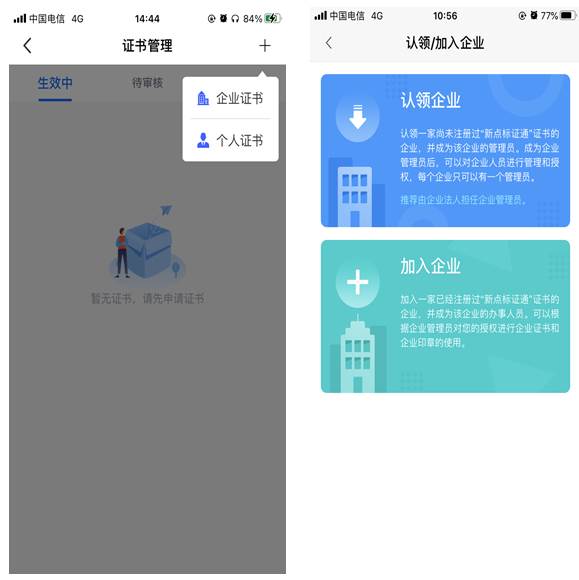 1、按照指引点击“+”号,可选择申领企业证书,见【图1】;