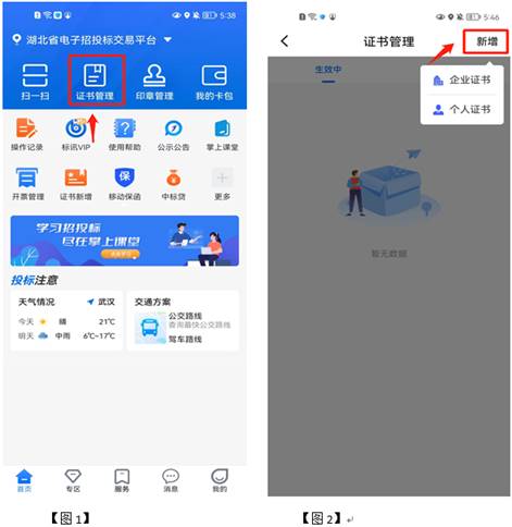 实名认证通过后点击首页中上方【证书管理】跳转至【图2】,点击【新增】,填写相关信息;
