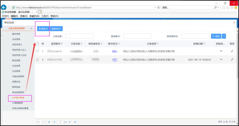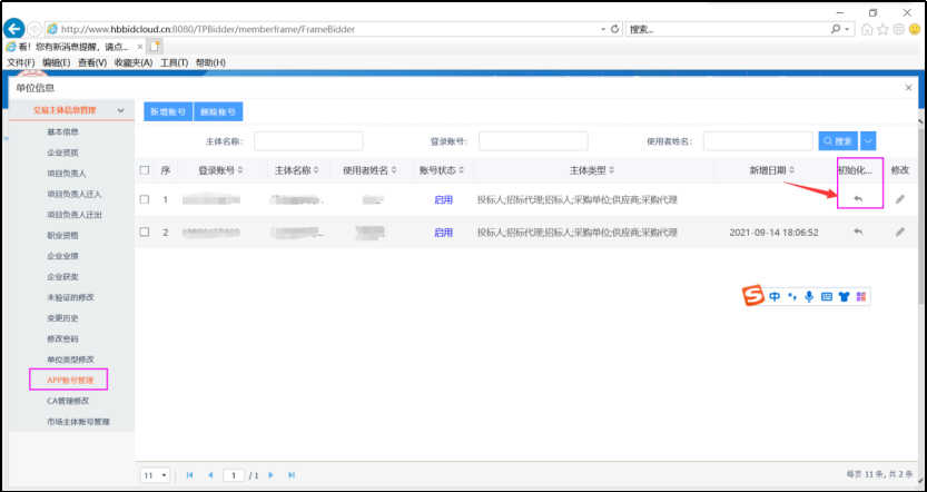 1、用户先登录到湖北省电子招投标交易平台,点击【单位信息】-【APP账号管理】,找到所要登录的账号,点击初始化(初始化密码系统会给出提示信息)即可。