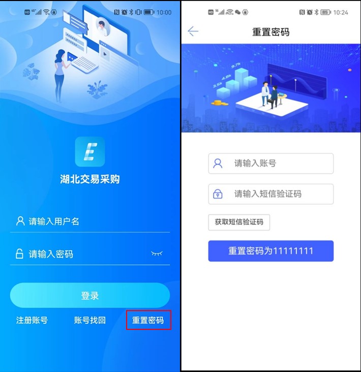 1、点击【重置密码】按钮,输入【账号】和【短信验证码】,再点击【重置密码为11111111】按钮,即可重置密码。